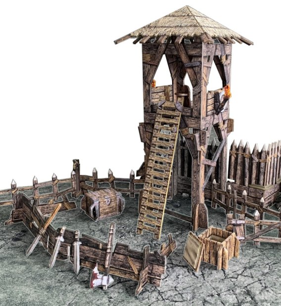 Niezbędnik każdego łucznika wieże obronne pomagają wojownikom w wypatrywaniu zagrożenia, by chronić życia niewinnych ludzi żyjących w miastach. BattleSystems: Lookout Tower zawiera wszystko, czego potrzebujesz do zbudowania drewnianej wieży widokowej, odpowiedniej do wielu gier fantasy i historycznych w skali 28-35 mm. Zestaw jest dostarczany w komplecie z rozproszonym terenem do uzupełnienia stołu. Wiele elementów jest modułowych i można je łączyć w różne kombinacje lub mieszać i dopasowywać do reszty zestawu. Teren jest dostarczany w płaskim opakowaniu na wysokiej jakości kartonie o dużej gęstości, zadrukowanym w pełnym kolorze po obu stronach, więc nie wymaga malowania! Teren wymaga montażu, a niektóre mniejsze części będą wymagały kleju. Więcej szczegółów i pełne instrukcje można znaleźć w samouczku.