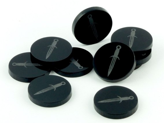 Zestaw 10 żetonów o średnicy 22 mm, wykonanych ze szkła akrylowego o grubości 3 mm. Te kolorowe krążki będą użyteczne w grach bitewnych, RPGach, grach Print & Play, w prototypach gier planszowych, jako zamienniki elementów oraz przy wprowadzaniu własnych modyfikacji zasad do gier. Po żetonach można pisać mazakami suchościeralnymi. Znaczniki zostały udekorowane grawerunkiem miecza, który nie zostanie starty podczas codziennego użytkowania znaczników. Do czyszczenia PMMA (szkła akrylowego - plexi) nie należy używać żadnych środków na bazie alkoholi. Polecamy wodę z mydłem, a w przypadku silnych zabrudzeń - cytrusowe środki czyszczące.