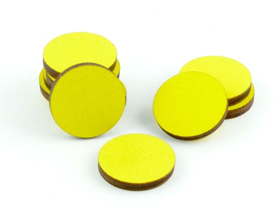 Zestaw 10 żetonów o średnicy 22 mm, wykonanych ze sklejki brzozowej o grubości 3 mm. Żetony te będą użyteczne w grach bitewnych, RPGach, grach Print & Play, w prototypach gier planszowych, jako zamienniki elementów oraz przy wprowadzaniu własnych modyfikacji zasad do gier.