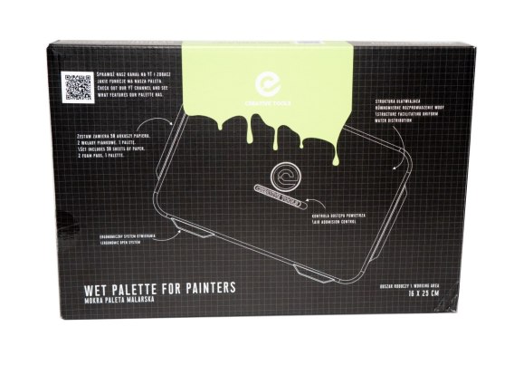 Mokra paleta z unikalnym wzornictwie zaprojektowana przez profesjonalnych polskich malarzy. Paleta posiada duży obszar roboczy 16x25cm, zawór kontroli dostępu powietrza (regulacja wilgotności), perforację dolnej części zapobiegającą pleśnieniu gąbkowego wkładu.