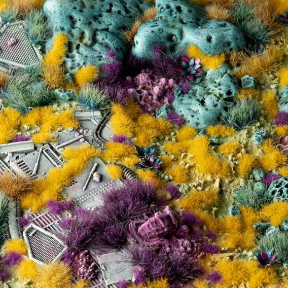 Jeden plastikowy arkusz zestawu Golden Yellow o wymiarach 14,5 cm x 6,5 cm zawiera ok. 115 naturalnie wyglądających kępek o nieregularnych kształtach i wysokości 2 mm.