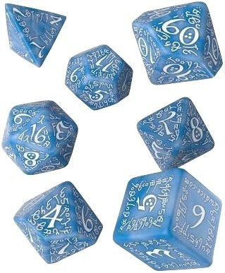 Kości RPG Elfickie Przejrzysto-niebieskie – „calca ar luinë”. Czy kochasz deszcz? Błękitne strugi w przejrzystym powietrzu? Jest coś niesamowitego w wodzie spadającej z nieba. Ta woda obmywa świat i daje życie całej Naturze. Całej, bez wyjątków. Ten zestaw kości jest dedykowany deszczowi i wszystkiemu dobremu, co ze sobą niesie. Przezroczyste kości, ozdobione błękitnymi rytymi cyframi i elfim pismem są symbolem odnowy, ponieważ po deszczu zawsze jest tęcza i odradza się nadzieja. Ciesz się deszczem dzięki naszym deszczowym kościom!