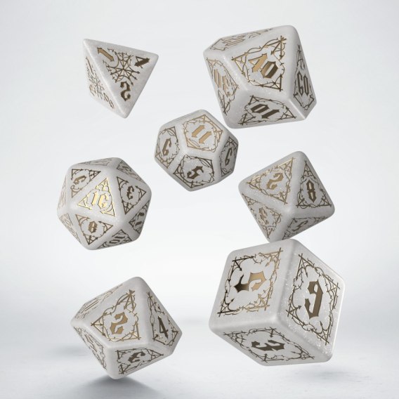 Komplet kości - Krwiopijców - Immortal to zestaw zarówno dla wszelkich nieśmiertelnych, jak i zabójców martwiaków. Kości Krwiopijców są białe jak kości Mistrza Gry, który snuje historię krainy wampirów pełnej istot łaknących krwi. Ryte zdobienia, nawiązują do najpiękniejszych wzorów cmentarnych bram, wypełnione są (nietoksyczną) złotą farbą, która wprost przypomina o tym, że wampiry są niczym królowie.