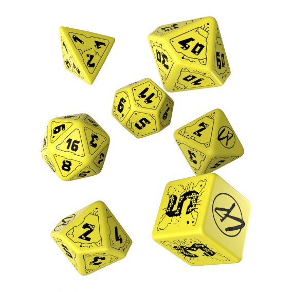 Po Czwartej Wojnie Korporacyjnej wszystko, co pozostało, to wyczucie stylu, wszczepy niezbędne do przetrwania, cyberdeck, broń… i ten zestaw kości. 7 wielościanów utrzymanych jest w tonacji Cyberpunk Red, z cyframi wpisanymi w układy scalone, a sam schemat kolorów jest bardzo czytelny, z czarnymi zdobieniami na żółtym tle.