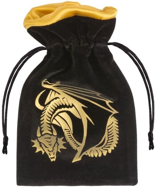 Ta szlachetna w swej postaci sakiewka wykonana została z grubego czarnego weluru z podszewką ze złotej satyny. Na boku nadrukowany został złotą farbą wizerunek pradawnego żmija, przodka wszystkich złotych smoków. Powinieneś być dumny, nosząc ich symbol, ponieważ ten wizerunek może dać ci szanse znalezienia smoczego skarbu i wygrania walki z tym ostatecznym przeciwnikiem. To bardzo bezpieczny worek na kości, gdyż wytrzymałe sznurki ściągające go z obu stron, mocno przytrzymują wszystko, co jest w środku.