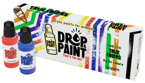 Czym jest Drop & Paint? Nie często w świecie modelarstwa jesteśmy świadkami prawdziwej rewolucji, co sprawia, że linia Drop & Paint producenta Scale 75 wzbudza jeszcze większy podziw. Drop & Paint to spełnienie marzeń każdego fana malowania aerografem, gdyż została stworzona z myślą o rozwiązaniu wszystkich problemów związanych z tym medium. Drop & Paint to zupełnie nowa akrylowa, zaprojektowana w celu ulepszenia i uproszczenia pracy z aerografem, bez względu na Twój stopień zaawansowania. Zapomnij o zatorach, pomiarach, obliczaniu proporcji, mieszaniu i żmudnych sesjach czyszczenia aerografu Drop & Paint można używać na wszystkich materiałach i nie trzeba ich rozcieńczać żadnym innym produktem. Dowiedz się więcej o Drop & Paint oglądając materiał producenta. Scale 75: Drop Paint - True Colors True Colors, jak sama nazwa wskazuje, to zestaw 8 farbek w odcieniach, które muszą znaleźć sie w arsenale każdego malarza i modelarza. Używaj ich, by nadawać swoim figurkom odważdnych akcentów lub mieszaj je z innymi, by uzyskiwać całą feerię barw. W zestawie Scale 75: Drop Paint - True Colors znajdziesz następujące odcienie: