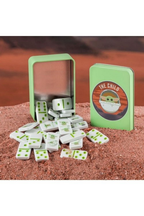 Ten zestaw 28 plastikowych kostek domina przedstawia dziecko, znane też jako „Baby Yoda”, pozujące na różne (równie urocze) sposoby po jednej stronie i standardowe miejsca po drugiej.
