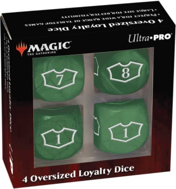 Show your Loyalty with the updated Ultra-Pro: Magic the Gathering - Forest - 22 mm Deluxe Loyalty Dice Set. Each face features the iconic "loyalty" outline with numbers 1-6 on two dice and 7-12 on the other two dice, allowing you to save up for that ult with a single die face representing your progress clearly.