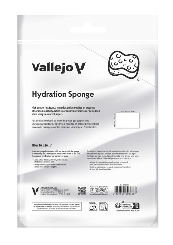 Wymienne gąbki nawilżające do mokrej palety to niezbędny element dla każdego malarza figurek i modeli. Hydration Sponge wykonane są z wysokiej gęstości pianki PVA o grubości 3 mm o zapewniają doskonałą zdolność absorpcji wody, utrzymując farby akrylowe w perfekcyjnym stanie przez długi czas. Dzięki białej barwie gąbki gwarantują precyzyjne postrzeganie kolorów, szczególnie podczas stosowania przezroczystych papierów nawilżających. Gąbki są kompatybilne z produktem Vallejo: B90001 - Wet Palette Set.