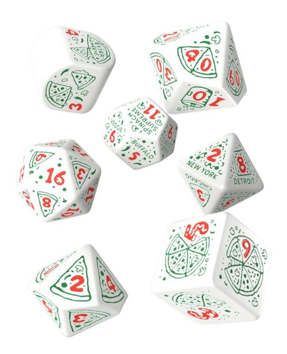 Zestaw Kości Pizza: Pepperoni Oto hołd dla jednego z najpopularniejszych elementów sesji RPG i spotkań towarzyskich pizzy! Od zawsze epickim przygodom przy stole towarzyszyły przekąski, a wśród nich ta jedyna uwielbiana przez wszystkich. Pizza, ze swoją różnorodnością i uniwersalnością, stała się symbolem tych chwil. Pragnęliśmy oddać hołd tej tradycji, tworząc zestaw kostek, który jeszcze mocniej przeniesie ten smakowity rekwizyt do świata gier fabularnych. To właśnie ta miłość do sesji RPG i wspólnych spotkań skłoniła Q-Workshop do stworzenia tego wyjątkowego zestawu. Zestaw Kości Pizza: Pepperoni łączy w sobie pasję do gier oraz kulinarne doznania, oferując kostki, które nie tylko cieszą oko, ale także wprowadzają element zabawy podczas rzutów. Cały zestaw został utrzymany w niebanalnym schemacie kolorów białym z zielonymi wzorami i czerwonymi cyframi co dodaje im autentycznego, włoskiego stylu. Zupełnie jak Pepperoni jest pierwszym wyborem dla prawdziwych koneserów pizzy, tak i te kości powinny być na pierwszym miejscu do powiększenia Waszej kolekcji. Design jest inspirowany klasycznym daniem włoskiej kuchni, oferując nie tylko wyjątkowy wygląd, ale także zabawne możliwości. Ścianki kilku kostek przedstawiają różne elementy pizzy, wprowadzając do Twoich sesji smakowity klimat. Dzięki nim możesz wylosować swój styl pizzy, dodatki i extra przysmaki! Dodatkowo, opakowanie przypomina klasyczne pudełko do pizzy w kolorach włoskiej flagi, a jego wytłoczone wnętrze wygląda jak apetyczna pizza! Odrobina pikanterii Sycący Zestaw Zestaw zawiera 7 elementów: K4, K6, K8, K10, K12, K20 i K100. W tym Modern K4. Pizza Party Każda kostka ma unikalny design D8 pozwala wylosować styl pizzy, D12 dodatki, a D4 extra przysmaki. Pieprzna Estetyka Tło kostek jest białe z zielonymi wzorami i czerwonymi cyframi, co oddaje kolory włoskiej flagi i wzmaga apetyt. Kulinarne dziedzictwo Zestaw Kości Pizza jest produkowany w Polsce, UE.